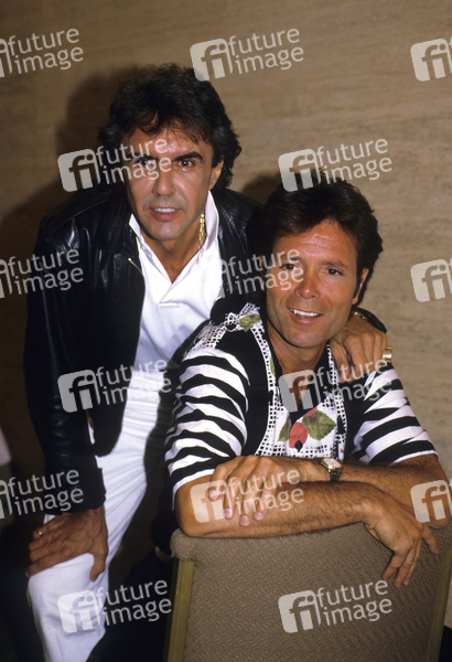 Dave Clark und Cliff Richard bei einer Pressekonferenz zur Präsentation von Dave Clark's Konzeptalbum 'Time' im Savoy Hotel. London, 26.07.1985