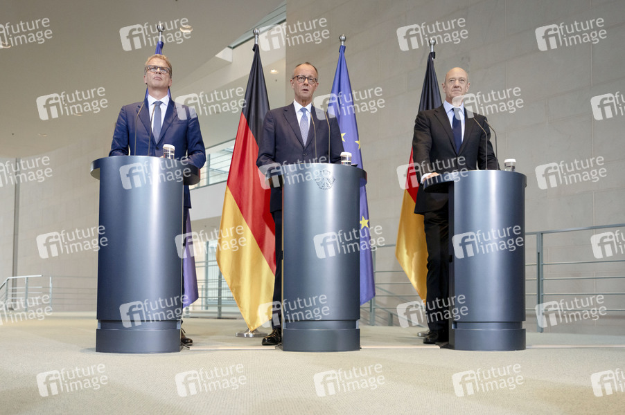 Christian Sewing, Friedrich Merz und Roland Busch bei der Pressekonferenz zur 'Made for Germany' Initiative im Bundeskanzleramt. Berlin, 21.07.2025