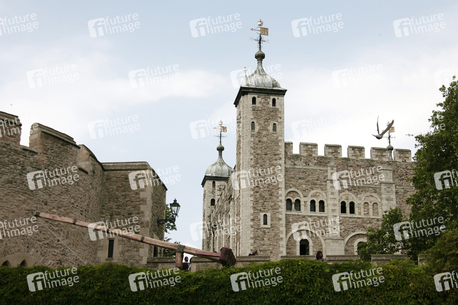 im Mittelalter errichteter Komplex aus mehreren befestigten Gebäuden entlang der Themse, Festung, Palast, Gefängnis, UNESCO Weltkulturerbe, heute werden im Tower die britischen Kronjuwelen aufbewahrt
