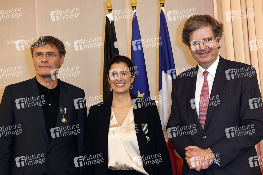 Martin Kochendörfer, Leila Hamid und Francois Delattre bei der Verleihung des Ordre des Arts et des Lettres an Leila Hamid und Martin Kochendörfer im Rahmen der Berlinale 2024 in der französischen Botschaft. Berlin, 19.02.2024