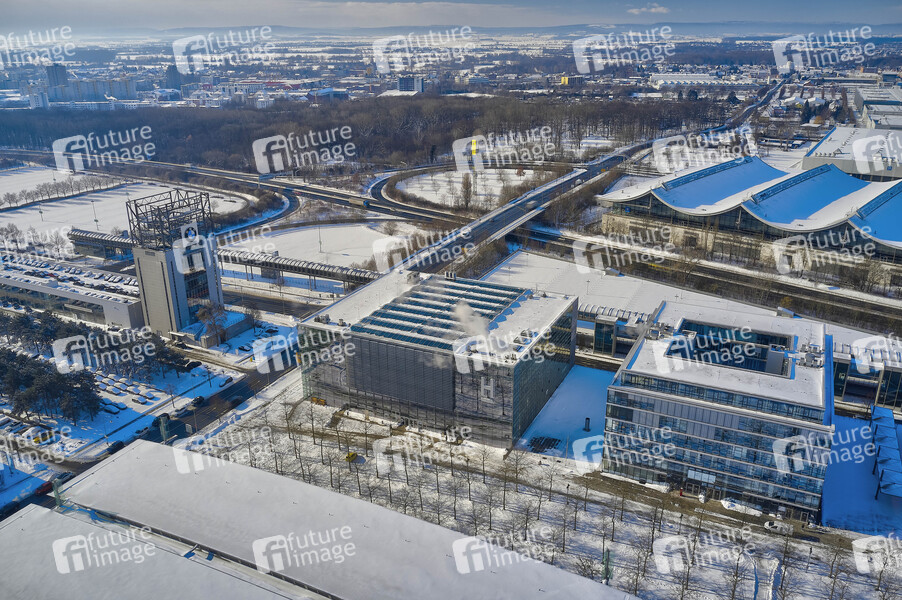 Luftbild vom EXPO 2000 Areal und dem Messegelände im Winter. Hannover, 11.02.2021