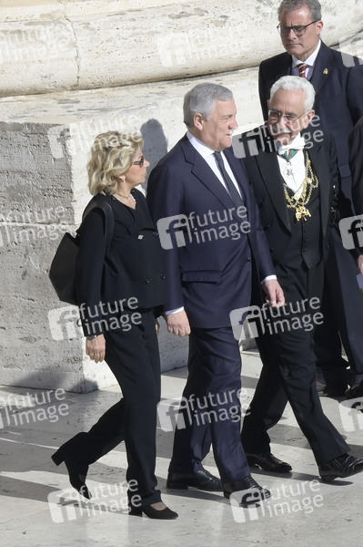 Antonio Tajani mit Ehefrau Brunella Orecchio bei der Trauermesse für den verstorbenen Papst Franziskus auf dem Petersplatz. Vatikanstadt, 26.04.2025