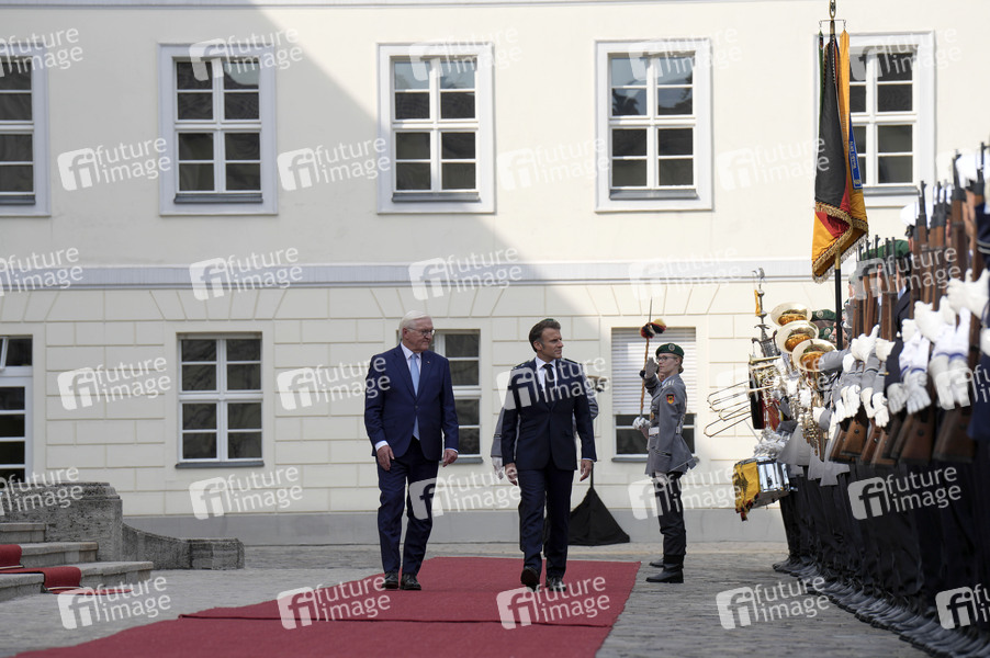 Frank-Walter Steinmeier und Emmanuel Macron beim Empfang des Staatspräsidenten der Französischen Republik mit militärischen Ehren im Schloss Bellevue. Berlin, 26.05.2024