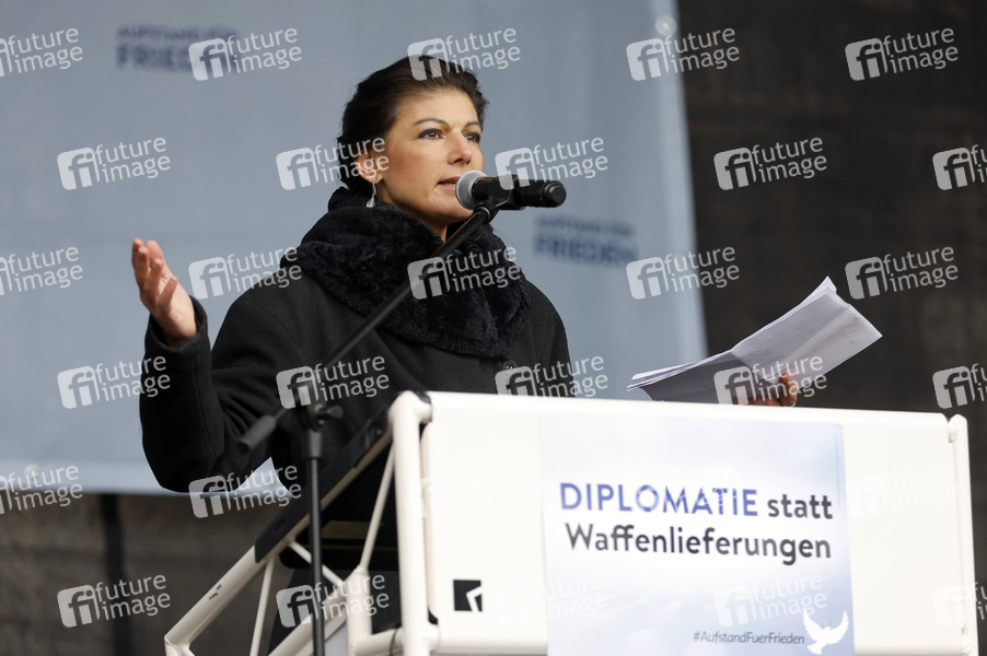 Sahra Wagenknecht spricht auf der umstrittenen Friedensdemo und Kundgebung für Verhandlungen mit Russland statt Waffenlieferungen für die Ukraine am Brandenburger Tor. Dazu aufgerufen haben die Linken-Politikerin Sahra Wagenknecht und die Frauenrechtlerin Alice Schwarzer. Berlin, 25.02.2023