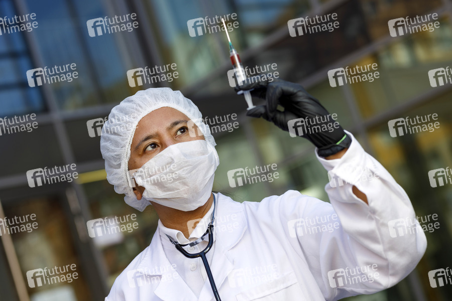 Eine Virologin posiert mit einer Spritze zur Impfung gegen das Corona-Virus. (Symbolfoto mit Model) Nürnberg, 23.04.2020