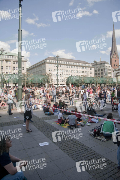 Demonstranten auf der Demo gegen die Einschränkung der Grundrechte wegen der Covid-19 Pandemie vor dem Hamburger Rathaus. Hamburg, 09.05.2020
