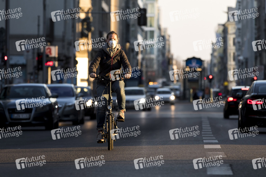 Radfahrerin mit Mundschutz während der Coronakrise. Berlin,. 25.03.2020
