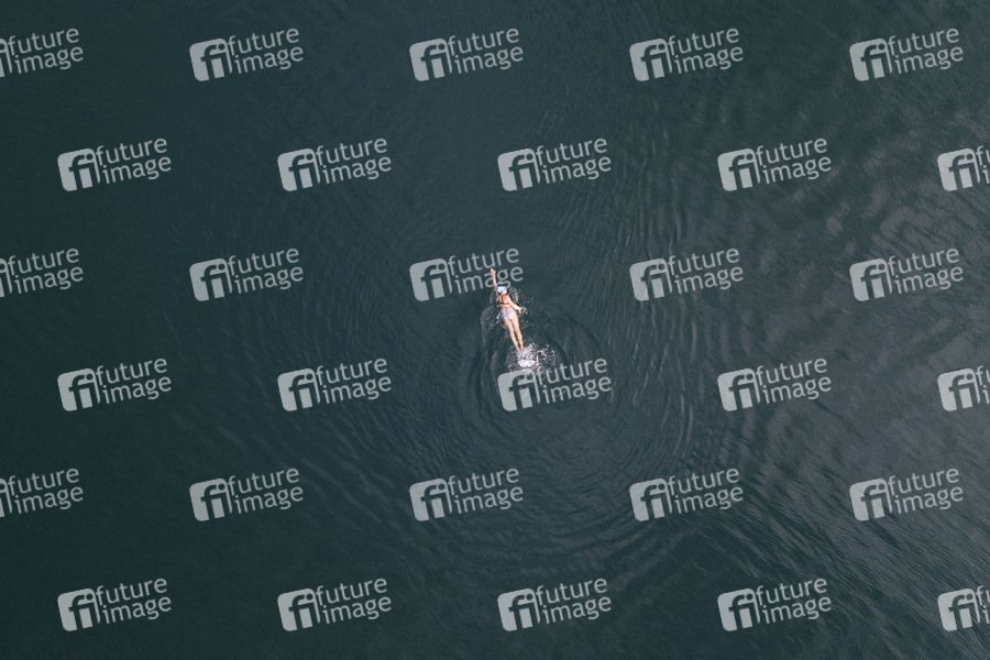 Luftaufnahme, Drohne, Schwimmen, Straussee, Wassersport, Brandenburg, Baden, Badesee, eiszeitlicher Rinnensee, Schwimmer, Ferien, Urlaub, See, Symbolbild, Symbolfoto