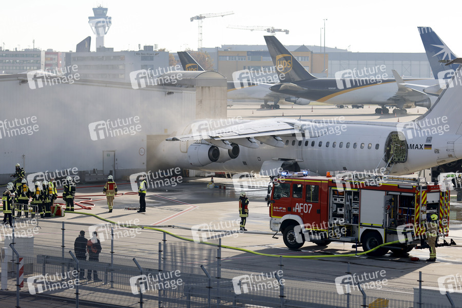 Einsatzkräftei der gemeinsamen ICAO-Notfallübung der Werkfeuerwehr, der Feuerwehr Köln, THW, Landespolizei, Bundespolizei und Bundeswehr am Köln Bonn Airport. Im Rahmen der Übung wird die Kollision eines Flugzeugs mit einem Passagierbus und einer Abfertigungshalle simuliert. Einsatzkräfte retten Verletzte aus dem in Brand geratenen Flugzeug. Köln, 06.11.2021