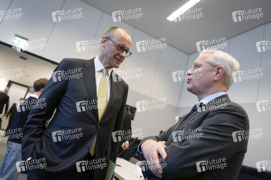 Friedrich Merz und Norbert Röttgen in der Fraktionssitzung der CDU/CSU-Bundestagsfraktion im Reichstagsgebäude. Berlin, 24.02.2026