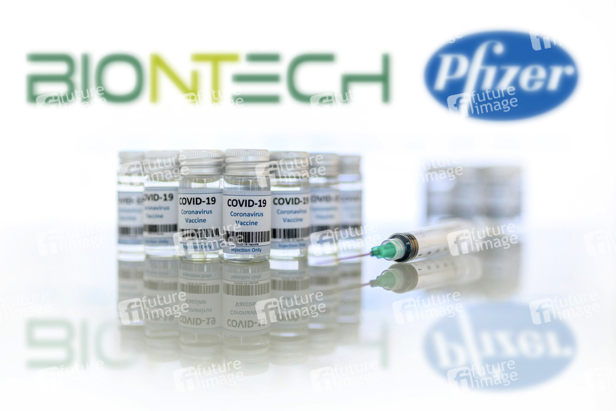 Impfdosen und Impfspritzen stehen auf einem Tisch vor dem BIontech-Logo und dem Pfizer-Logo. (Themenbild, Symbolbild)