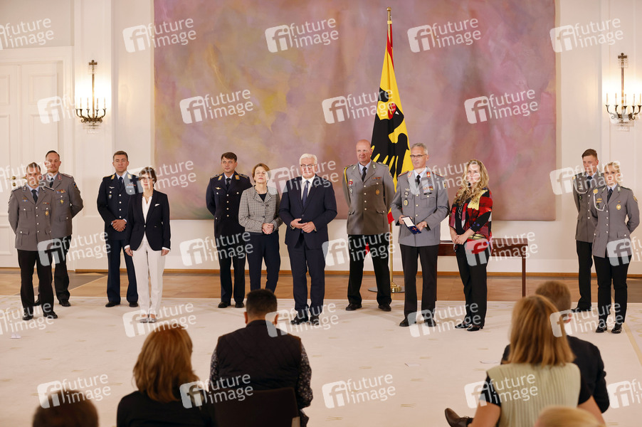 Annegret Kramp-Karrenbauer, Elke Büdenbender, Frank-Walter Steinmeier, Brigadegeneral Jens Arlt und Gäste bei der Verleihung des Verdienstkreuzes 1. Klasse an Brigadegeneral Jens Arlt im Schloss Bellevue. Berlin, 17.09.2021
