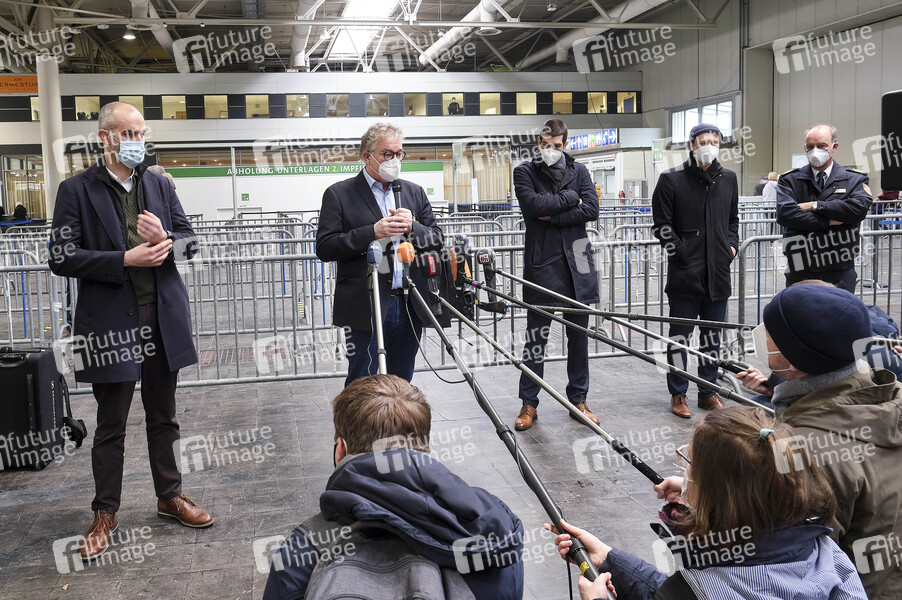 Oberbürgermeister Belit Onay und Regionspräsident Hauke Jagau u.a. bei der Eröffnung des Gemeinsamen Impfzentrums (GIZ) von Region und Landeshauptstadt Hannover auf dem Messegelände in der Messehalle 25. Hannover, 01.02.2021