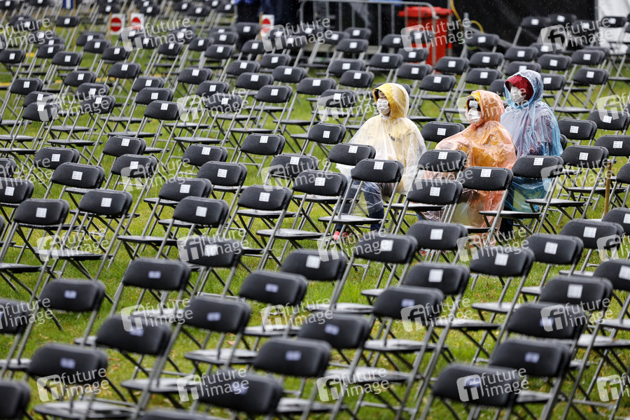 Fans von Helge Schneider harren bei Regen in den Stuhlreihen des Bonner Kunstrasen mit Gesichtsmasken aus. In NRW will das Land mit dem Inkrafttreten der neuen Coronaschutzverordnung verstärkt auf das Einhalten der 3G-Regel bei Konzerten und Events setzen und damit einen weiteren Schritt in Richtung Normalität tun. (Themenbild, Symbolbild) Bonn, 17.08.2021