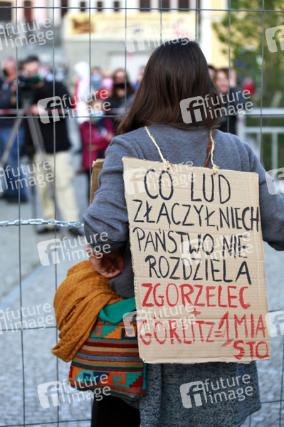 Demonstranten protestieren gegen die geschlossene Grenze zwischen Zgorzelec und Görlitz. Zur Eindämmung des Coronaviruses haben unter anderem Polen und Tschechien Mitte März die Grenzen nach Deutschland geschlossen. Hintergrund des Protestes sind die aktuellen Einschränkungen für Arbeiter, die normalerweise täglich nach Deutschland pendeln, jetzt aber nach Wiedereinreise nach Polen in zweiwöchige Quarantäne müssten. Außerdem sind grenzübergreifende, familiäre Kontakte durch die geschlossenen Grenzen nahezu ausgeschlossen. Görlitz, 24.04.2020