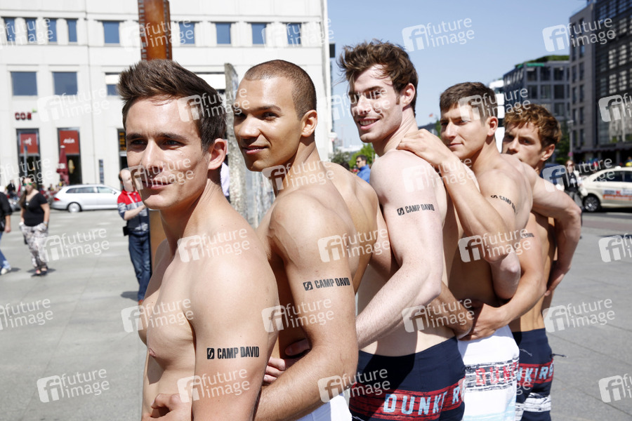 Open Air-Fashionshow des Menswear-Labels Camp David mit Surfern in sexy Beachwear der 'Special Collection Björn Dunkerbeck by Camp David' am Potsdamer Platz. Berlin, 28.04.2014