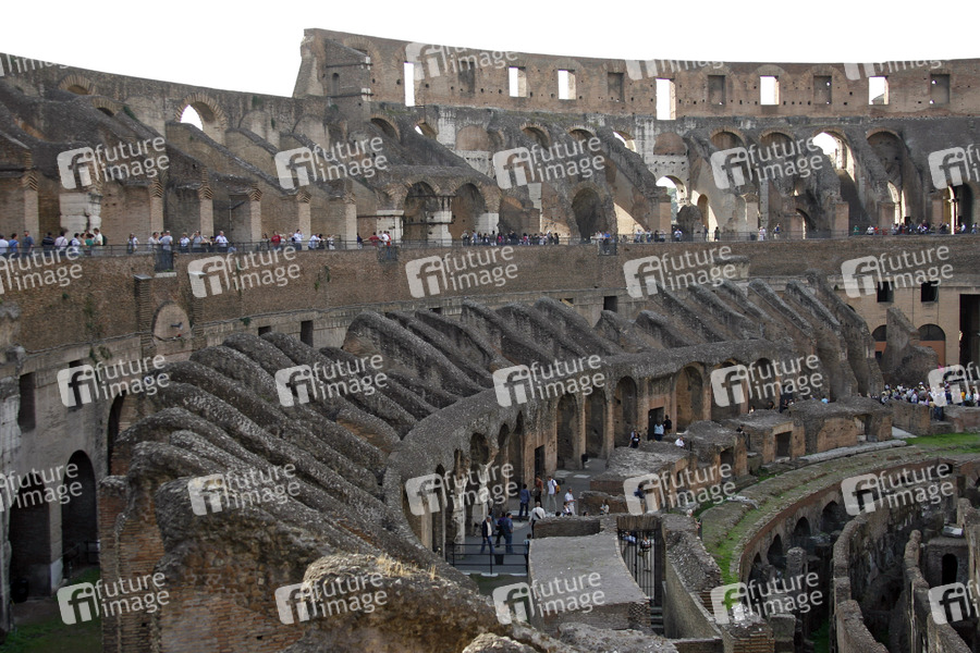 Antiker Name: Amphitheatrum Novum oder Amphitheatrum Flavium, der größte geschlossene Bau der römischen Antike, Fertigstellung im Jahr 80, es konnten ca. 50.000 Zuschauer Platz finden, das Kolosseum ist ellipsenförmig gebaut, Breite: 156 Meter, Länge: 188 Meter, Umfang: 527 Meter, Höhe: 48 Meter, es bestand aus drei übereinander angeordneten Arkadenreihen zu je 80 Bögen, als Arena war das Kolosseum über 400 Jahre lang in Betrieb, Veranstaltungsort von in aller Regel höchst grausamen Spielen, üblich waren vor allem Gladiatorenkämpfe (munera) und Tierhetzen (venationes)