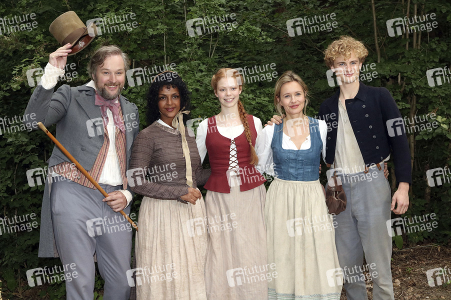 Stephan Grossmann, Dennenesch Zoude, Valerie Sophie Körfer, Stefanie Stappenbeck und Justus Czaja beim Pressefototermin am Set des Märchenfilms 'Das Märchen vom goldenen Taler' für die ARD-Märchenreihe 'Sechs auf einen Streich' im Museumsdorf Düppel. Berlin, 08.07.2020