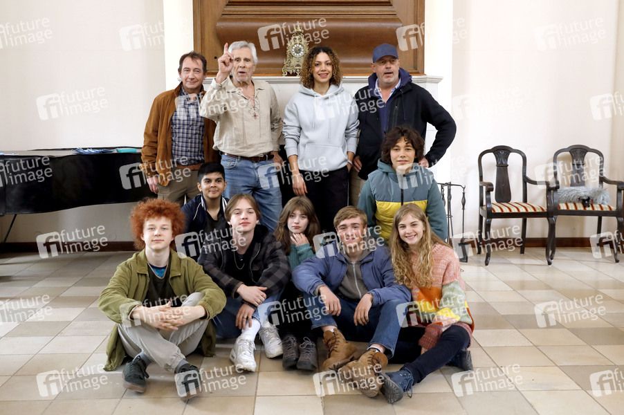 Stehend: Thorsten Merten, Gojko Mitic, Haley Jones und Mark Schlichter. Sitzend: Leopold Ferdinand Schill, Dennis Kharazmi, Egon Werler, Lisa Moell, Luis Vorbach, Ron Antony Renzenbrink und Leni Deschner beim Fototermin am Set des Kinofilms 'Alfons Zitterbacke - Chaos auf der Klassenfahrt' auf Schloss Ostrau. Ostrau, 21.10.2021