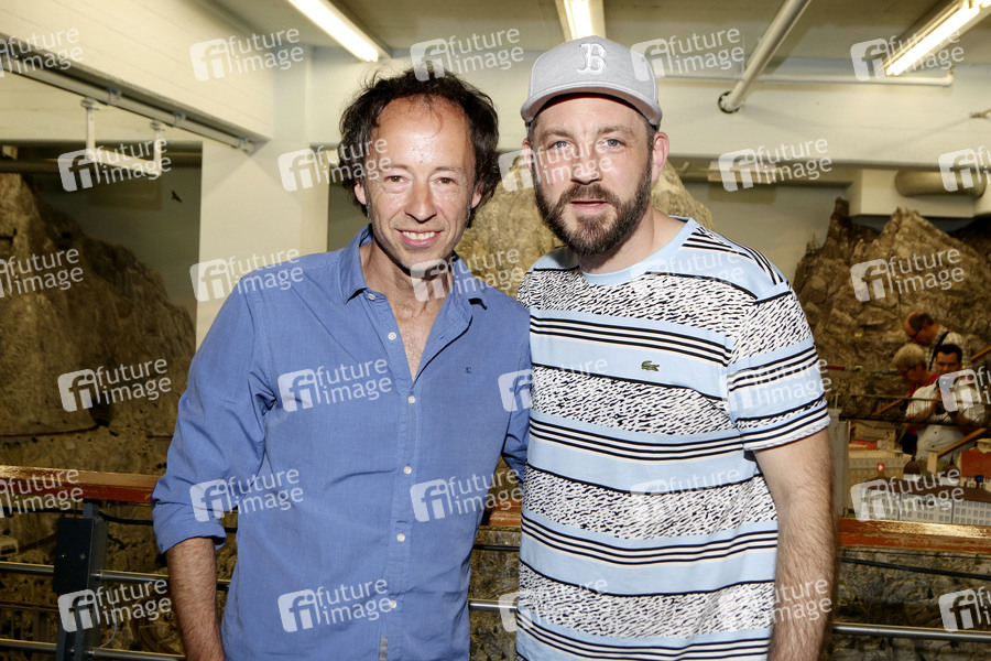 Gerrit Braun und Das Bo bei der Präsentation des offiziellen Musikvideos von Das Bo zur Fussball WM mit einem Liveauftritt im Modell von der Schweiz im Miniaturwunderland. Hamburg, 27.05.2014