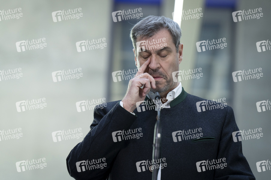 Markus Söder bei einer Pressekonferenz nach den Sondierungsgesprächen der Partei- und Fraktionsspitzen von SPD, CDU und CSU im Reichstagsgebäude. Berlin, 08.03.2025