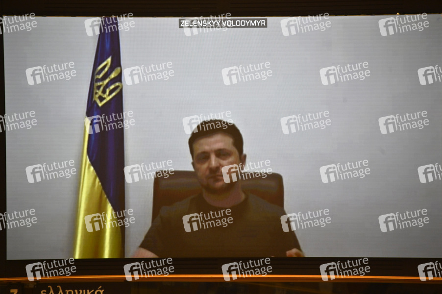 Rede, außerordentliche Sitzung, Politik, Europaparlament, EU-Parlament, EP, Parlament der Europäischen Union, Parlamentum Europaeum, MdEP, Mitglied des Europäischen Parlaments, Krieg, Angriffskrieg, Einmarsch, Europapolitik, internationale Krise, internationale Politik, internationales Recht, Konflikt, Krieg, Kriegsbeginn, Kriegsverbrechen, Krise, Militäroffensive, Militärschlag, Sanktionen, Solidarität, Solidaritätsbekundung, Ukraine, Ukrainekonflikt, Ukraine-Konflikt, Ukrainekrise, Ukraine-Russland-Krise, Politiker, Wolodymyr Selenskyj, Schauspieler, Regisseur, Monderator, Produzent, Präsident der Ukraine