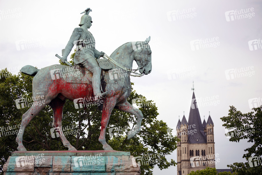 Ein Reiterstandbild von Kaiser Wilhelm II. an der Hohenzollernbrücke wurde mit Farbe verunstaltet. Köln, 26.06.2020