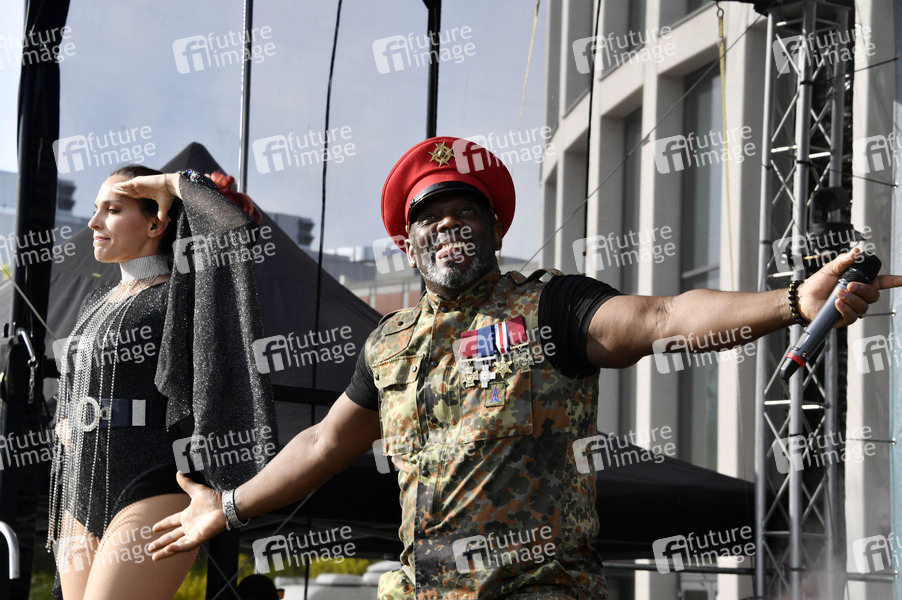 Michelle Stanley und Bruce Lacy von Captain Jack live beim 90er Drive-In-Konzert von rbb 88.8 auf dem Messegelände. Berlin, 21.05.2020