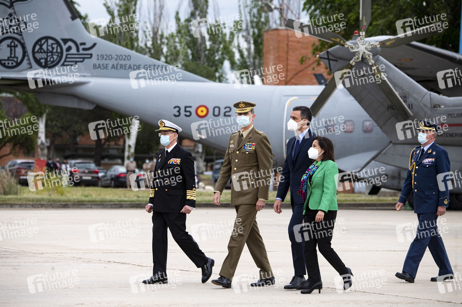 König Felipe VI. von Spanien, Pedro Sanchez und Margarita Robles beim Ehrenempfang auf der Torrejón Air Base für die letzten Soldaten die aus ihrem Einsatz in Afghanistan zurück kommen,. Die Beteiligung Spaniens am Krieg in Afghanistan begann am 27. Dezember 2001. Torrejón de Ardoz, 13.05.2021