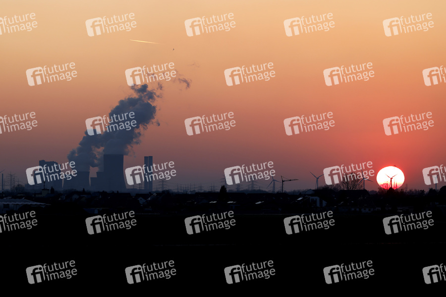 Das Kohlekraftwerk Niederaußem und umliegende Stromleitungen zeichnen sich gegen die untergehende Sonne ab. Aus Sicht von Brandenburgs Ministerpräsident Dietmar Woidke (SPD) muss nach dem Angriff Russlands auf die Ukraine der auf 2030 vorgezogene Kohleausstieg neu diskutiert werden. Bergheim, 05.03.2022