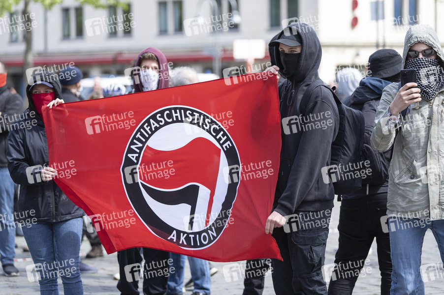 Linksautonome der Antifa bei einer unerlaubten 1. Mai-Demonstration auf dem Heumarkt. Köln, 01.05.2020
