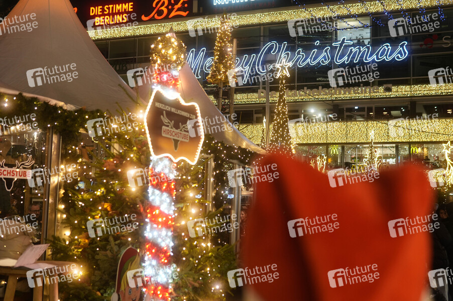 Merry Christmas Schriftzug am Europacenter beim City-Weihnachtsmarkt an der Gedächtniskirche auf dem Breitscheidplatz. Berlin, 16.12.2024