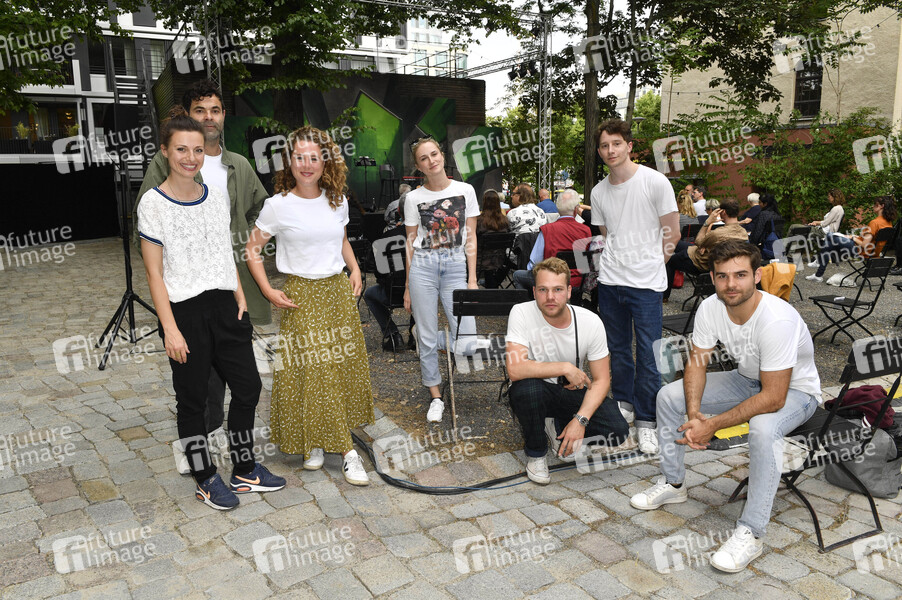 Julia Hartmann, Andreas Döhler, Klara Deutschmann, Pia Micaela Barucki, Gast, Jonathan Berlin und Lucas Reiber beim musikalischen Abend 'Bonnie ohne Kleid' mit Sina Martens im Hof-Theater des Berliner Ensembles. Berlin, 12.06.2020