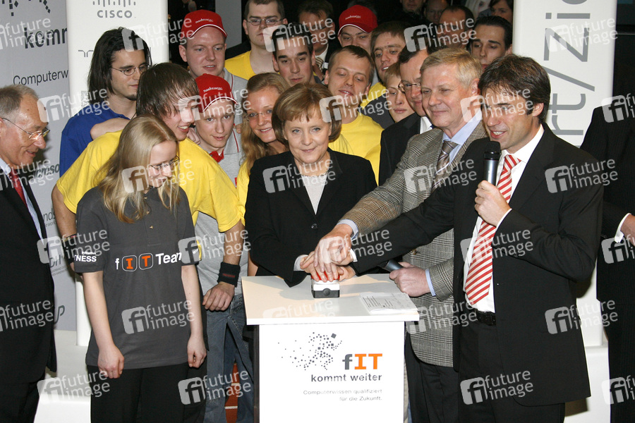 Eröffnungsrundgang der Bundeskanzlerin zur CeBIT 2007, der weltgrößten Messe für Informations- und Computertechnik auf dem Messegelände in Hannover. Mit Auszubildenden am Stand von Microsoft.