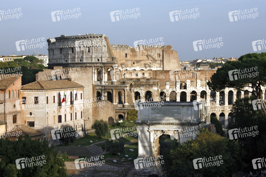 Antiker Name: Amphitheatrum Novum oder Amphitheatrum Flavium, der größte geschlossene Bau der römischen Antike, Fertigstellung im Jahr 80, es konnten ca. 50.000 Zuschauer Platz finden, das Kolosseum ist ellipsenförmig gebaut, Breite: 156 Meter, Länge: 188 Meter, Umfang: 527 Meter, Höhe: 48 Meter, es bestand aus drei übereinander angeordneten Arkadenreihen zu je 80 Bögen, als Arena war das Kolosseum über 400 Jahre lang in Betrieb, Veranstaltungsort von in aller Regel höchst grausamen Spielen, üblich waren vor allem Gladiatorenkämpfe (munera) und Tierhetzen (venationes)