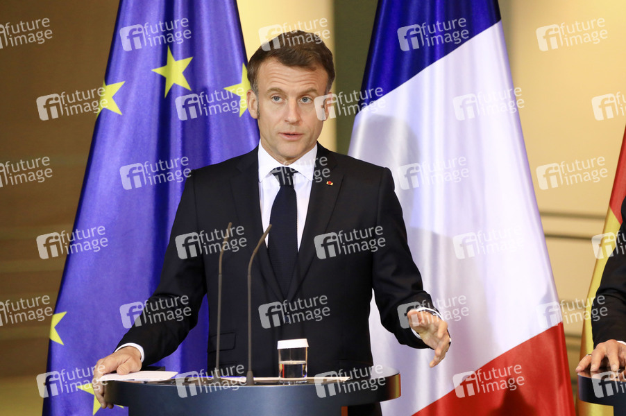 Emmanuel Macron beim Empfang des Staatspräsidenten der Französischen Republik zu einem gemeinsamen Gespräch mit dem Bundeskanzler mit anschließendem Pressestatement im Bundeskanzleramt. Berlin, 18.03.2025