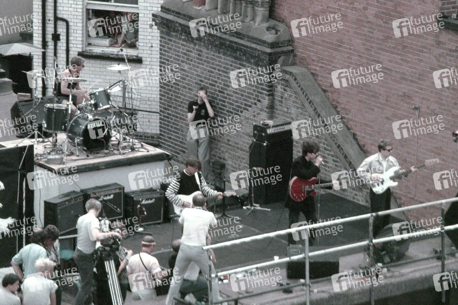 Pete de Freitas, Will Sergeant, Ian McCulloch und Les Pattinson von Echo & the Bunnymen live bei einem Rooftop-Konzert zum 20 jährigen Jubiläum des Beatles-Albums 'Sgt. Pepper’s Lonely Hearts Club Band' auf dem Dach vom HMV Record Store in der Oxford Street. London, 06.07.1987