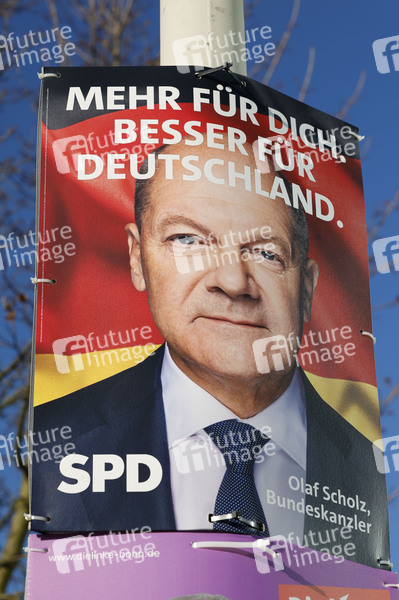 Beeinflussung der Wählerin, Botschaft, Bundestagswahl, Bundestagswahlen, Bundestagswahlkampf, Eigenwerbung, Kleinflächenplakat, Kampagne, Kandidat, Kandidaten, Kandidierende, Logo, Partei, Partei-Symbol, Parteien, Parteienwerbung, Parteilogo, Plakat, Plakatkampagne, Plakatständer, Politik, Politiker, Politikerinnen, Protestwähler, Slogan, Stammwähler, Wahl, Wahlbeeinflussung, Wahlbeteiligung, Wählen, Wählerschicht, Wählerschichten, Wahlkampagne, Wahlkampf, Wahlkampfmodus, Wahlkandidat, Wahlprogramm, Wahltermin, Wahlwerbung, Wirkung, Wirkungsmacht, SPD, Sozialdemokratische Partei Deutschlands, Olaf Scholz, Symbolbild, Symbolfoto, Themenbild