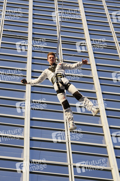 Base Flying von Jochen Schweizer mit den Hauptdarstellern von 'Gangs' auf dem Park Inn Hotel am Alexanderplatz in Berlin