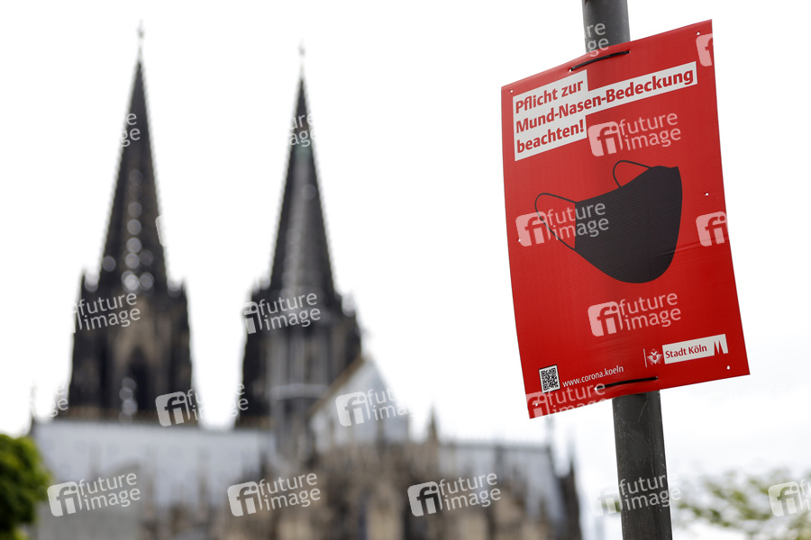 Die Maskenpflicht im Freien soll fallen. Diese und einige weitere Lockerungen der Corona-Schutzmaßnahmen kündigte das Land NRW an. Im Bild ein Hnweisschicht auf die Pflicht zum Tragen einer Mund-Nasen-Bedeckung, wie sie die Stadt Köln 2021 in der Innenstadt aufhing. Inzwischen sind die Schilder entfernt. (Archivbild, Themenbild, Symbolbild) Köln, 28.09.2021