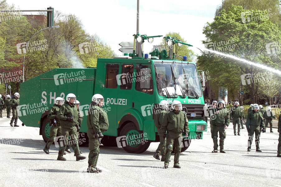 Politik, Tag der Arbeit, 1. Mai, Polizei, Wasserwerfer, Polizisten, Polizei, Demonstranten, Demonstration, Steine, Pflastersteine