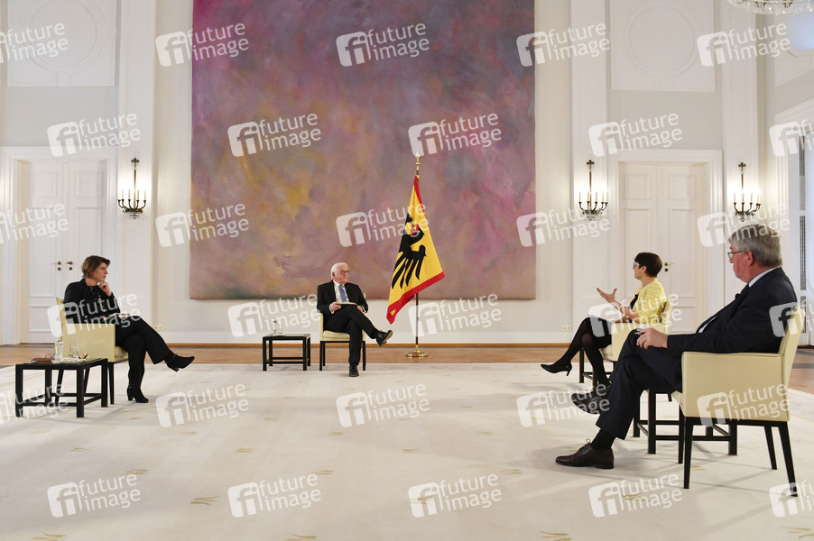 Christina Morina, Frank-Walter Steinmeier, Helene Miard-Delacroix und Eckart Conze bei der Ansprache des Bundespräsidenten und Gespräch mit Historikerinnen und Historikern zum 150. Jahrestag der Gründung des Deutschen Reiches im Schloss Bellevue. Berlin, 13.01.2021