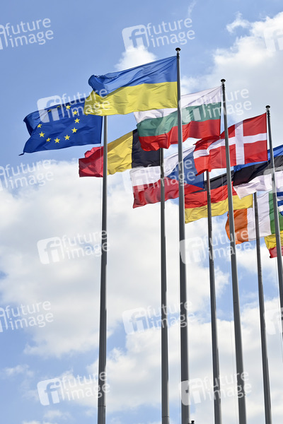 Europäisches Parlament, Strasbourg, Strassburg, Plenum, Plenarsaal, Debatte, EU-Gesetze, EU-Gesetzgebung, Demokratie, Mitgliedsländer, EU-Recht, EU-Politik, Bündnis, Union, Europa-Politik, EU-Parlament, European Parliament, European Union, EU, Europäische Union, EU-Kommission, Europäische Kommission, EU-Gebäude, EU-Land, EU-Länder, Flagge, Flaggen, Außenpolitik, Europaparlament, Beflaggung, Ukraine, Krieg, Solidarität, ukrainische Flagge, EU-Flagge, Europäische Flagge, EU-Sterne, Russland, Krieg, Angriff, Invasion, EU-Kandidat, Beitrittskandidat, Aufnahmegespräche, Aufnahmeantrag, Symbolbild, Symbolfoto