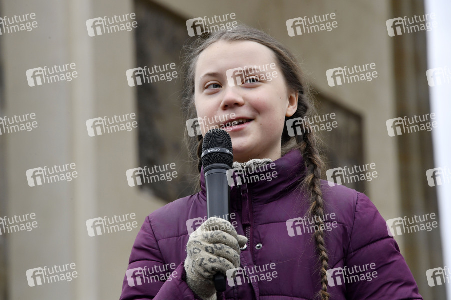 Greta Thunberg spricht bei der 'Fridays for Future' Schülerdemonstration gegen die Klimapolitik vor dem Brandenburger Tor. Berlin, 29.03.2019