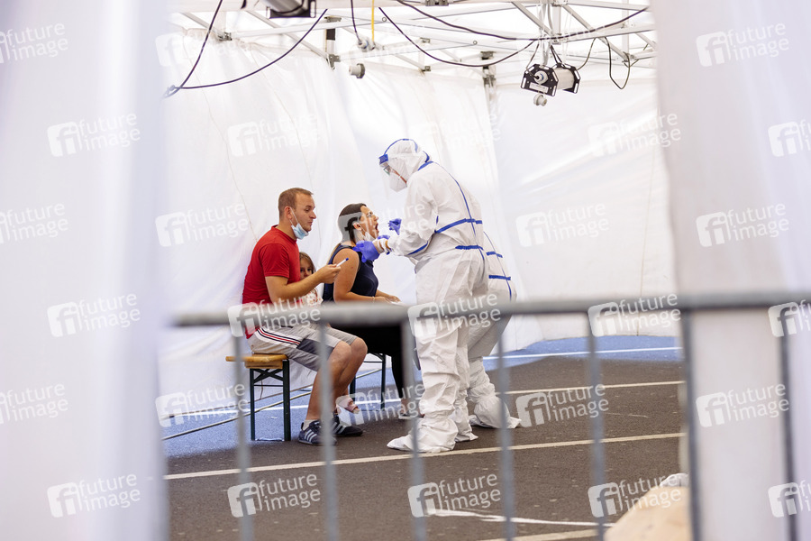 Wegen der Corona-Krise bzw. Corona-Pandemie werden im Corona-Testzentrum am Köln Bonn Airport Reiserückkehrer aus Risikogebieten auf Corona getestet. Köln, 11.08.2020