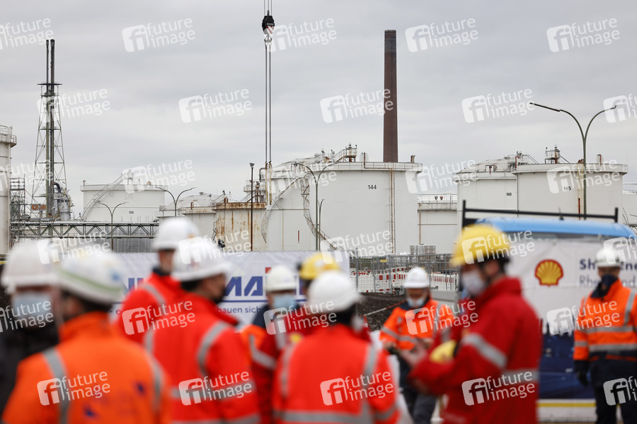 Baustelle, Bauarbeiter, Baustellenbereich, Werksgelände, Firmengelände, Öltanks, Öltank, Auftritt, Shell, Industrie, Raffinerie, Royal Dutch Shell, Produktionsanlage, Gaskonzern, Gasindustrie, Ölindustrie, Ölkonzern, Treibstoff, Klimaziele, Förderung, Energiewende, Chemieindustrie, Kohlendioxid-Ausstoß, Gas, Erneuerbare Energien, Umweltschutz, Energietechnik, Umweltpolitik, Gaspreis, Gaspreise, Industriepolitik, Energiepolitik, Shell Energy, Chemicals Park Rheinland, CO2-neutral, Nachhaltigkeit, CO2-Neutralität, Biogas, Bio-Gas, Bio-LNG, flüssiges Gas, Biomethan, Methangas, Methan-Gas, Baustelle, Helme, Helmpflicht, Shell Deutschland