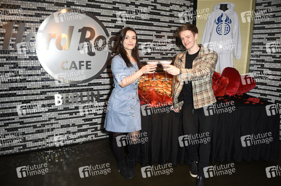 Timur Bartels mit Freundin Michelle Math beim Probieren, Anschneiden und Verteilen der Valentinstag-Burger im Hard Rock Cafe. Berlin, 13.02.2020