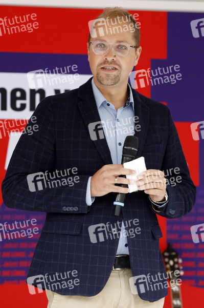 Sebastian Lange bei der Städtetour der Partei Die Linke zur Bundestagswahl 2021 mit dem Motto 'Sozial gerecht. Vor Ort. Jetzt!' auf dem Alten Markt. Stralsund, 28.08.2021