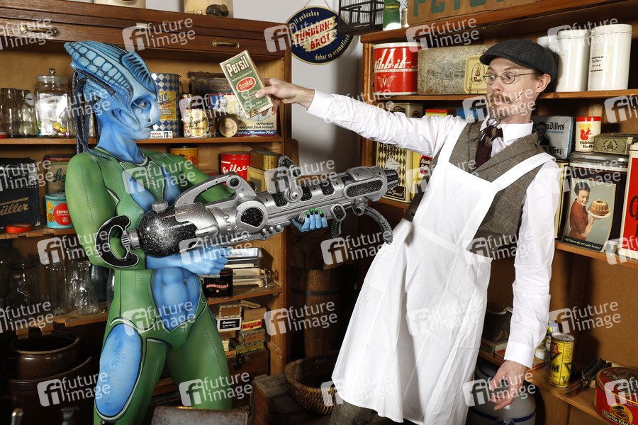 GEEK ART - Bodypainting and Transformaking: 'Aliens besuchen Einkaufsladen auf der Erde' mit Barbara und Collin als Verkäufer in einem Lebensmittelladen in den 1950er Jahren. Fotografiert im Dorfmuseum des Vereins Tundirum. Tündern, 07.06.2020 - Ein Projekt des Fotografen Tschiponnique Skupin und des Bodypainters und Transformakers Enrico Lein