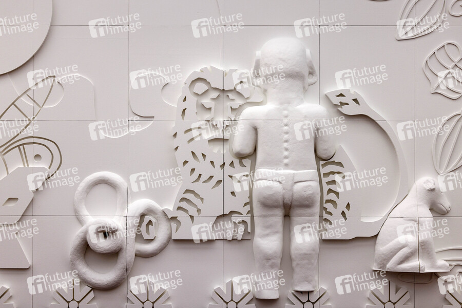 Das neu Wandbild von Minerva Cuevas bei einem Pressetermin zur Vorstellung ihres Werkes, welches sie anlässlich der dritten Ausgabe der Reihe Schultze Projects speziell für die große Stirnwand im Treppenhaus des Museum Ludwig geschaffen hat. Die großformatige Arbeit soll an das Ehepaar Bernard Schultze und Ursula Schultze-Bluhm erinnern, deren Nachlass das Museum Ludwig verwaltet. Köln, 5.11.2021